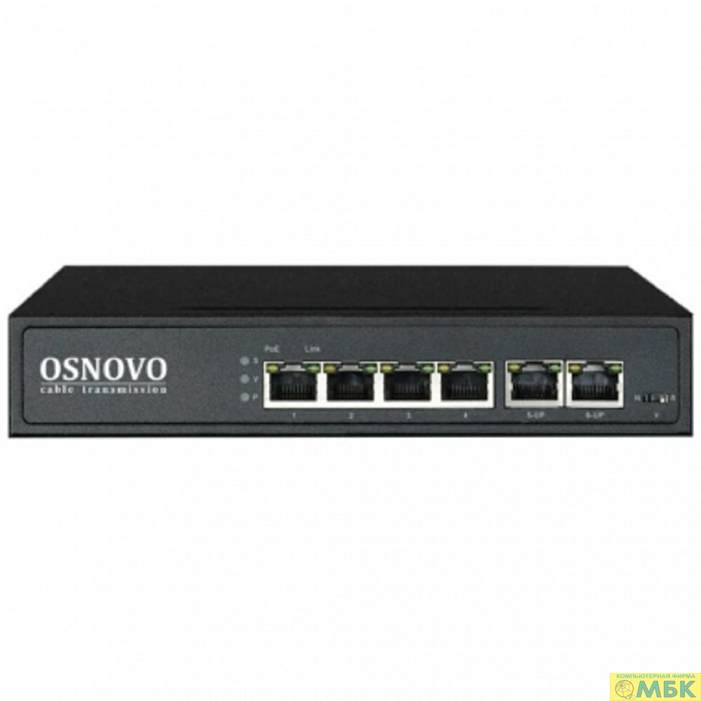 Коммутатор/ OSNOVO PoE коммутатор 6 портов, 4 PoE порта 10/100 Base-T, 2*10/100 Base-T Uplink, до 30W на порт, суммарно до 80W (SW-20600(80W))