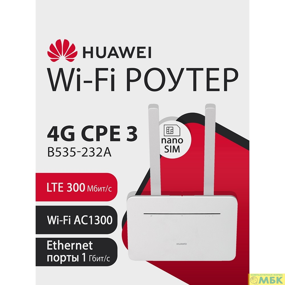 HUAWEI 51060HUX B535-232a Маршрутизатор 4G CPE 3 Wi-Fi 5 AC1300, LTE CAT7 300 Мбит/с SIM card slot, 1* LAN/WAN port GE, 3* LAN ports GE, WHITE