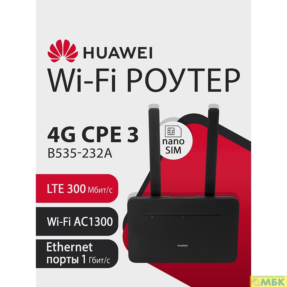 HUAWEI 51060HVA B535-232a Маршрутизатор 4G CPE 3 Wi-Fi 5 AC1300, LTE CAT7 300 Мбит/с SIM card slot, 1* LAN/WAN port GE, 3* LAN ports GE, BLACK