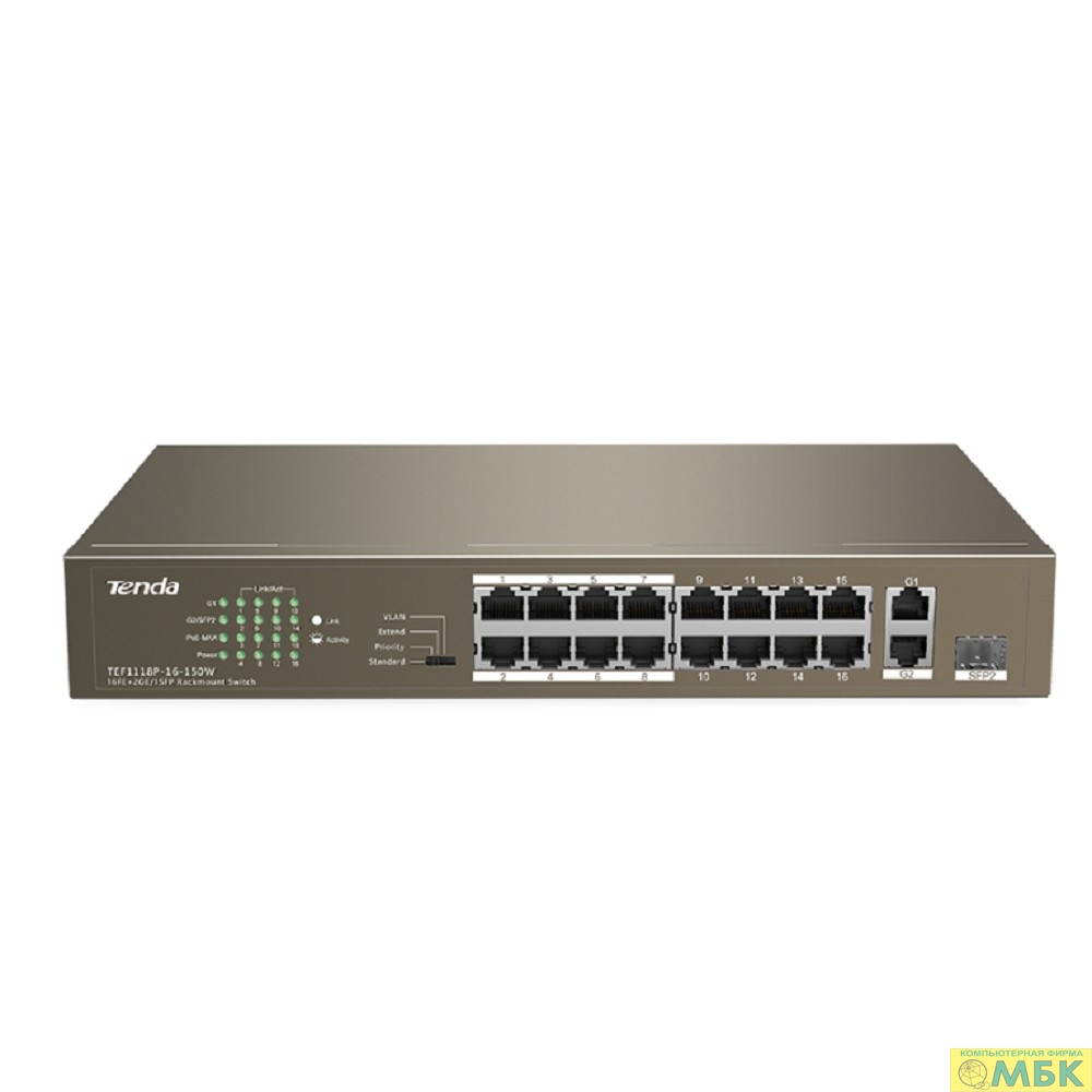 TENDA TEF1118P-16-150W Коммутатор в стойку 16-Ports 10/100 Base-TX + 2-Ports 10/100/1000 Base-T + 1-Port 1000 Base-X SFP 16-Ports PoE(PoE бюджет 130W)