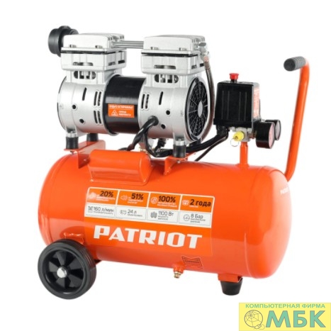 PATRIOT WO 24-160 Компрессор [525306375] {Безмасляный; Мощн. 1,1 кВт; Напр. 230В Об. двиг.: 2850 об/мин; Производительность: 160 л/мин; Объем ресивера: 24 л; Давление: 8 бар}