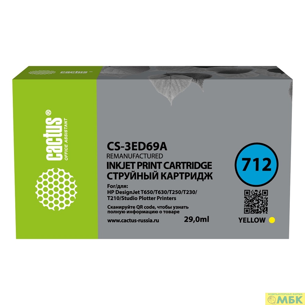 Картридж струйный Cactus CS-3ED69A 712 желтый (29мл) для HP DJ T230/630