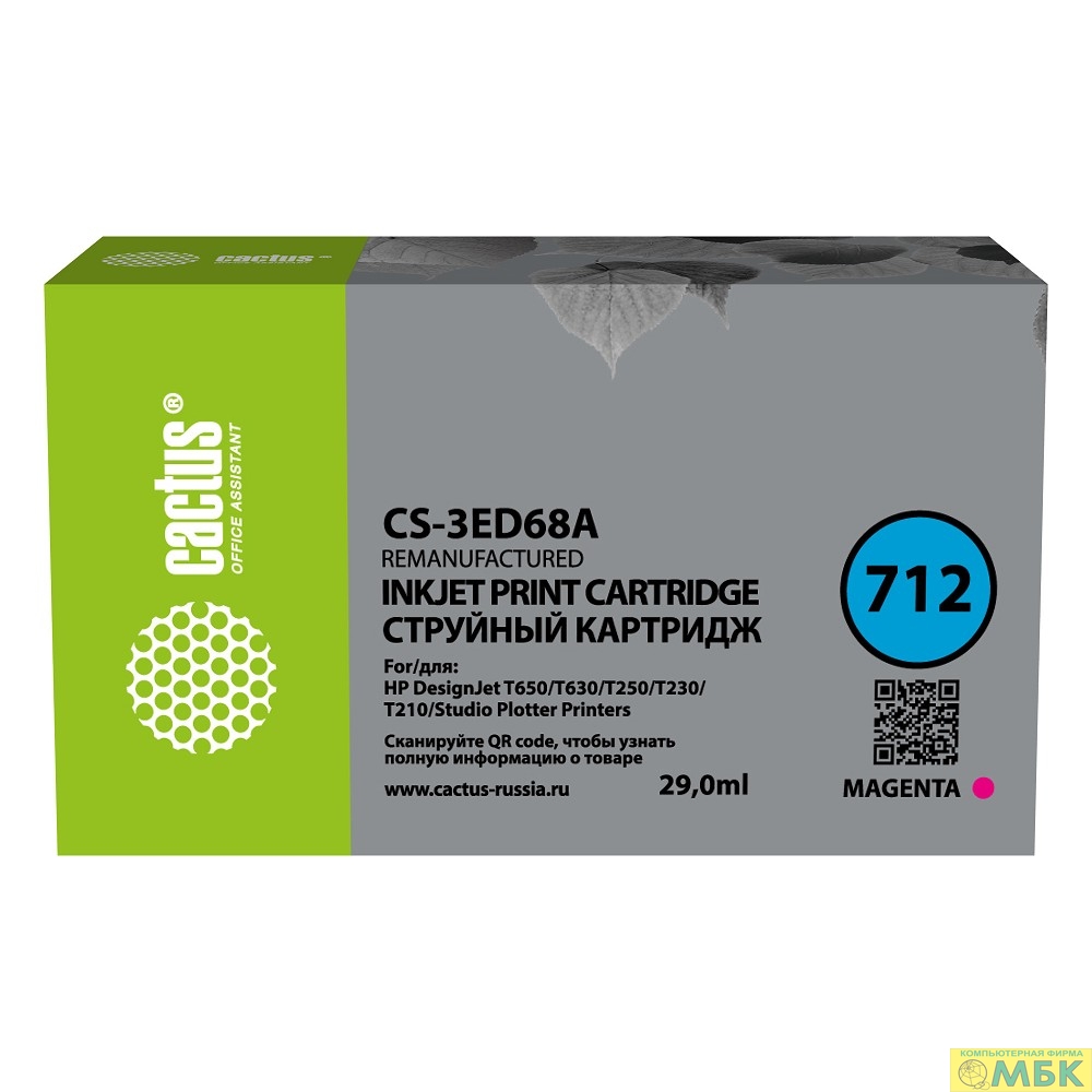 Картридж струйный Cactus CS-3ED68A 712 пурпурный (29мл) для HP DJ T230/630