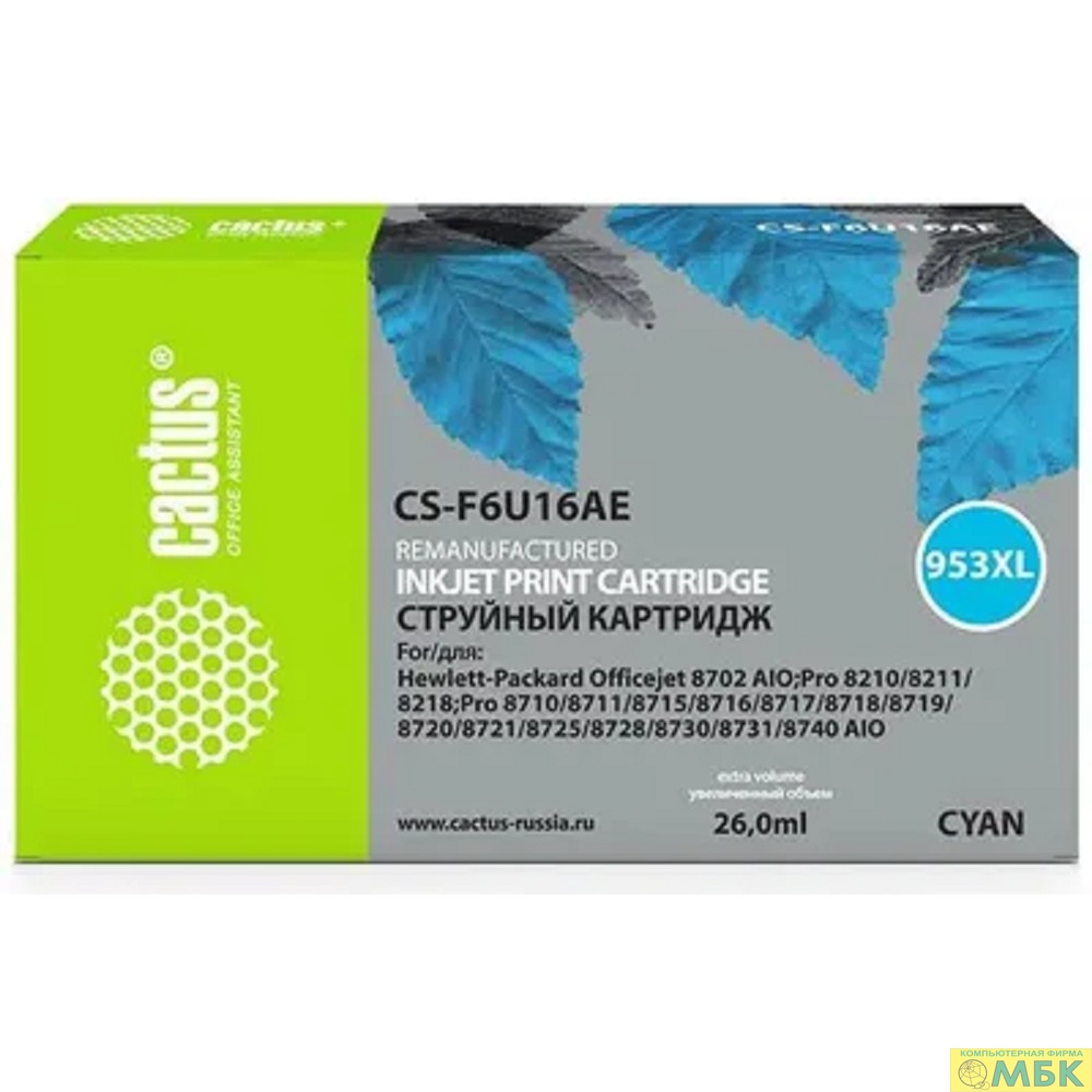 CACTUS F6U16AE Картридж №953XL для HP OJ Pro 7740/8210/8218/8710/8715, голубой, 26 мл.