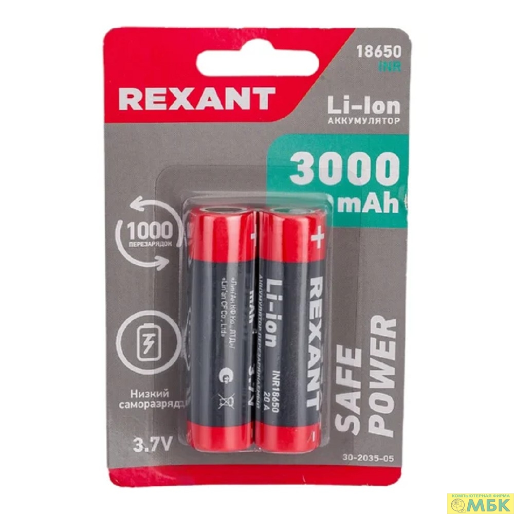 Rexant (30-2035-05) Аккумулятор Li-ion 18650, 3,7В, 3000мАч, без платы защиты, плоский контакт, 2 шт, блистер