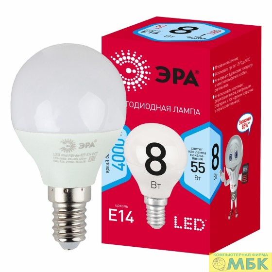 ЭРА Б0052440 Лампочка светодиодная RED LINE LED P45-8W-840-E14 R E14 / Е14 8 Вт шар нейтральный белый свет