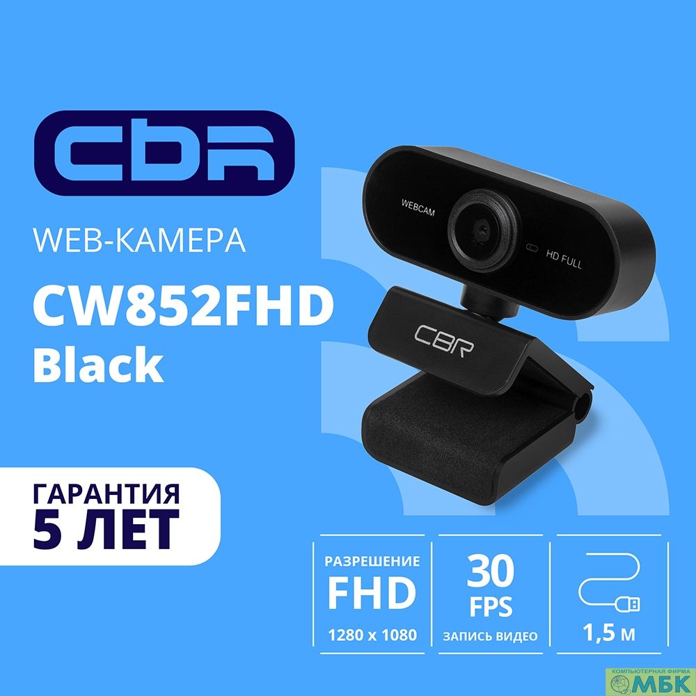 CBR CW 852FHD Black, Веб-камера с матрицей 2 МП, разрешение видео 1920х1080, USB 2.0, встроенный микрофон с шумоподавлением, фикс.фокус, крепление на мониторе, длина кабеля 1,5 м, цвет чёрный