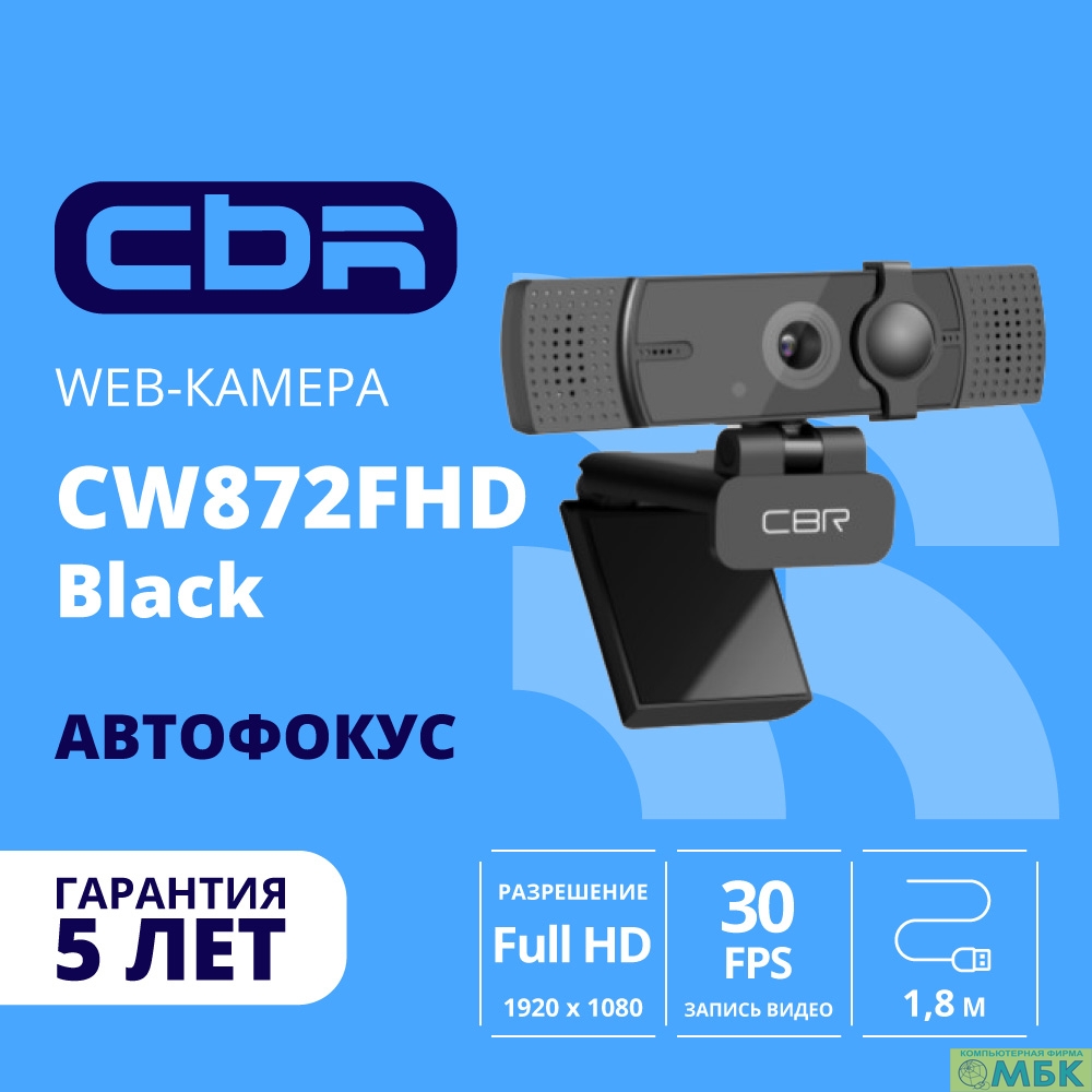 CBR CW 872FHD Black, Веб-камера с матрицей 5 МП, разрешение видео 1920х1080, USB 2.0, встроенный микрофон с шумоподавлением, автофокус, крепление на мониторе, шторка, длина кабеля 1,8 м, цвет чёрный